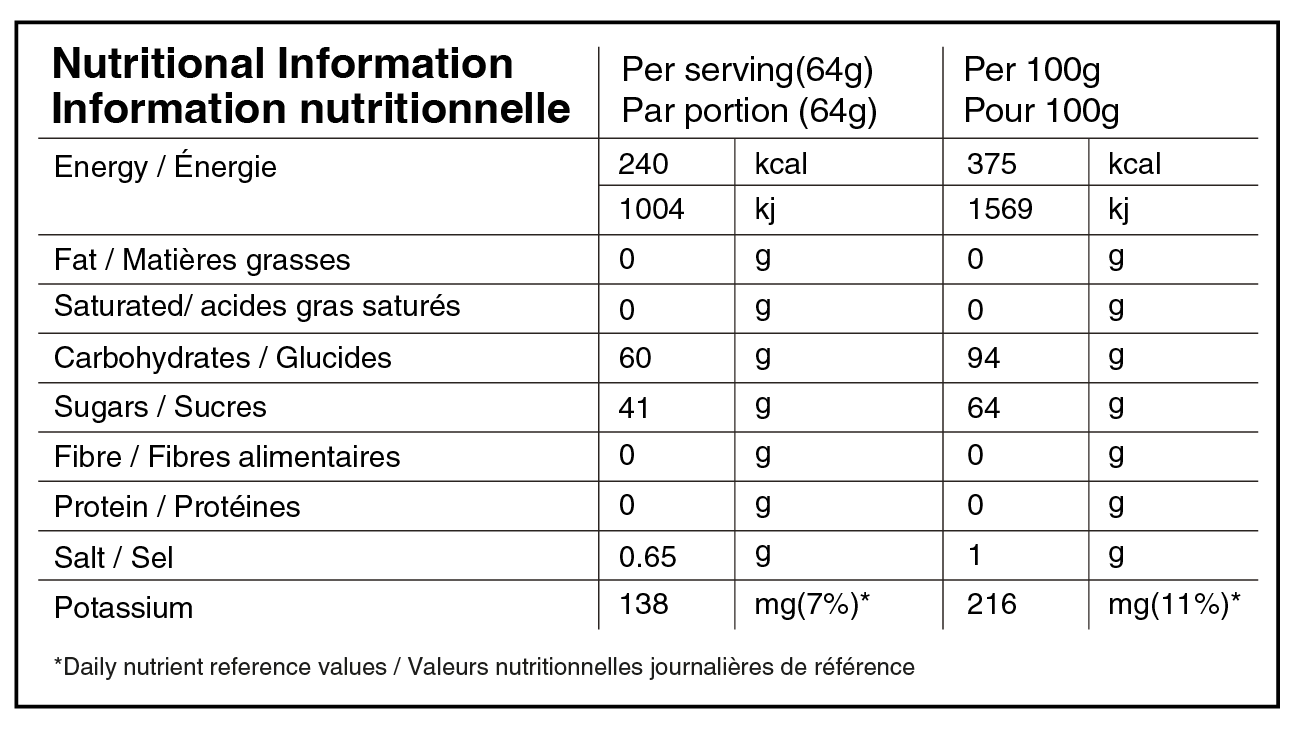 Ingredients: PalatinoseTM (isomaltulose), tapioca maltodextrin, sea salt, acidity regulator (potassium citrate). *Isomaltulose is a natural source of glucose and fructose, made from beet sugar.