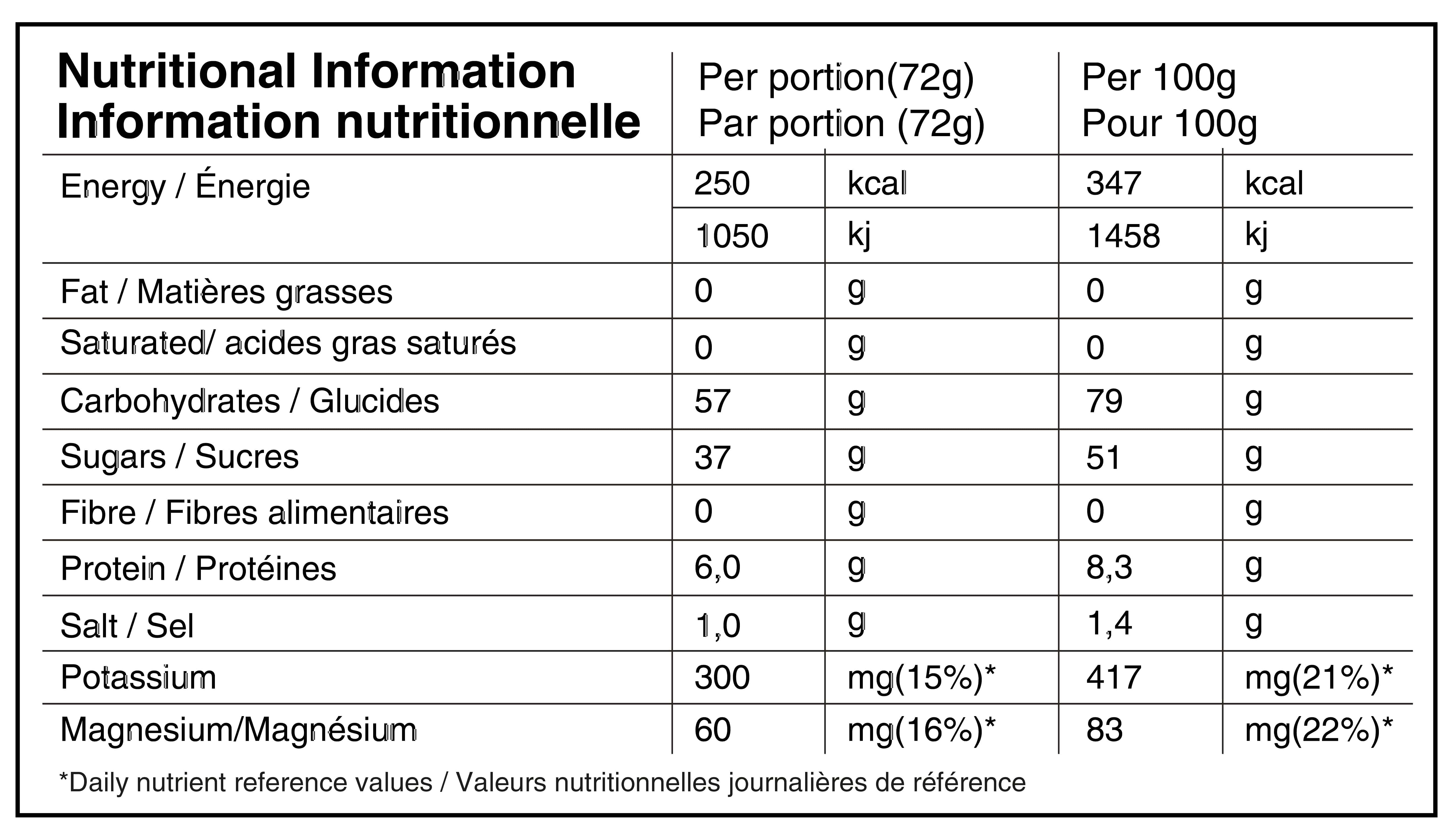 Chaque portion fournit 250 calories par 500 ml d’eau, avec une nutrition complète pour une énergie longue durée. Un sac de 720g permet de préparer 10 portions, soit 5L de boisson d'effort.