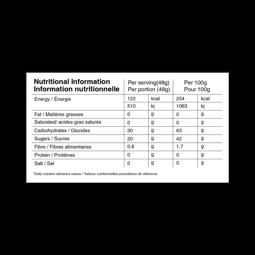 Conçu pour les efforts intenses, chaque gel fournit 25 ou 30 g de glucides pour t’aider à repousser tes limites. Sa texture de gelée onctueuse facilite sa consommation en mouvement, tandis que sa faible sucrositté aide à prévenir la fatigue gustative.