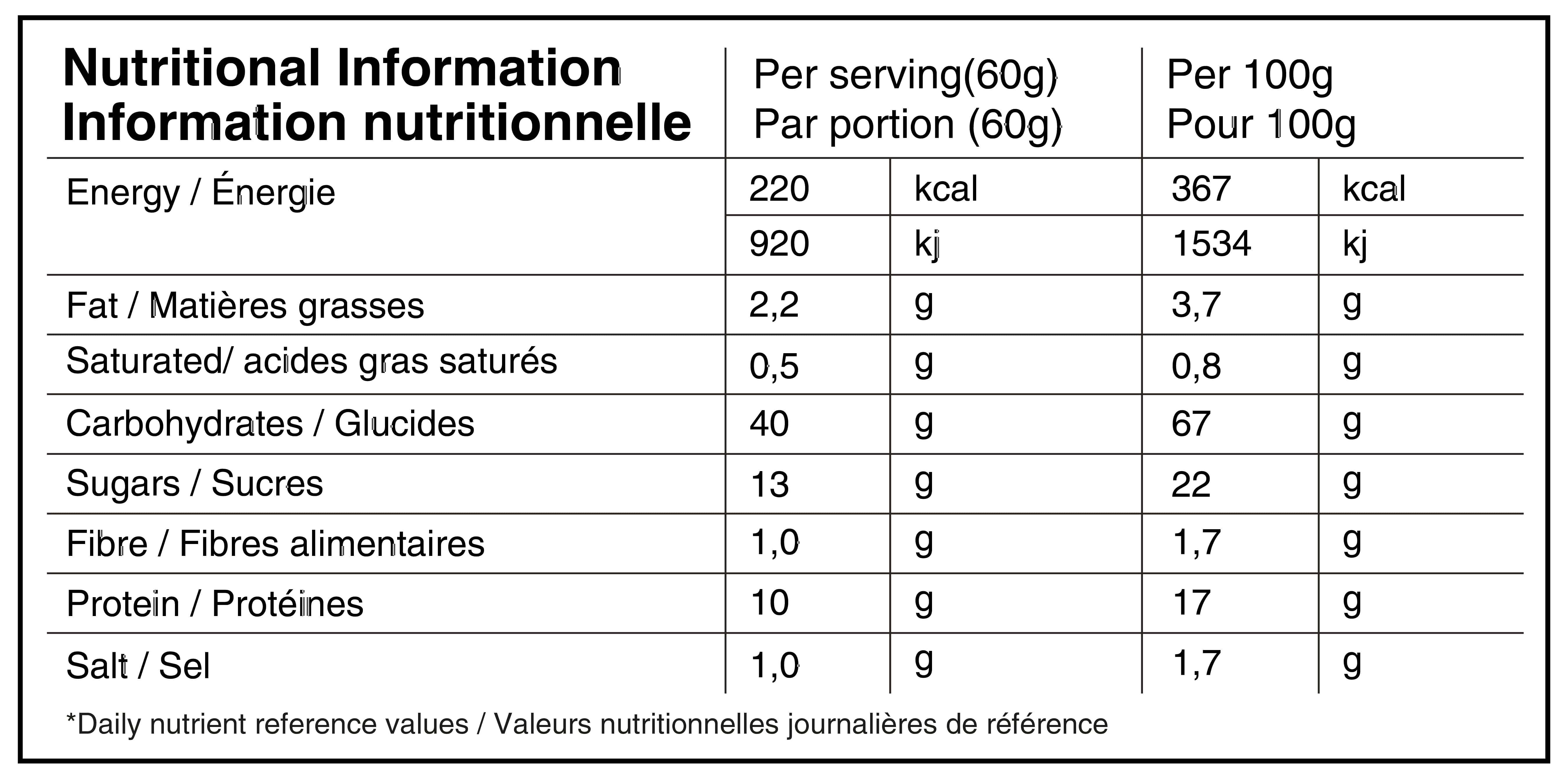 Farine d’avoine hydrolysée, Extrait sec de sirop de riz, Sucre de canne, Isolat de protéine de pois, Isolat de protéine de colza, Sel de mer, Arômes naturels.