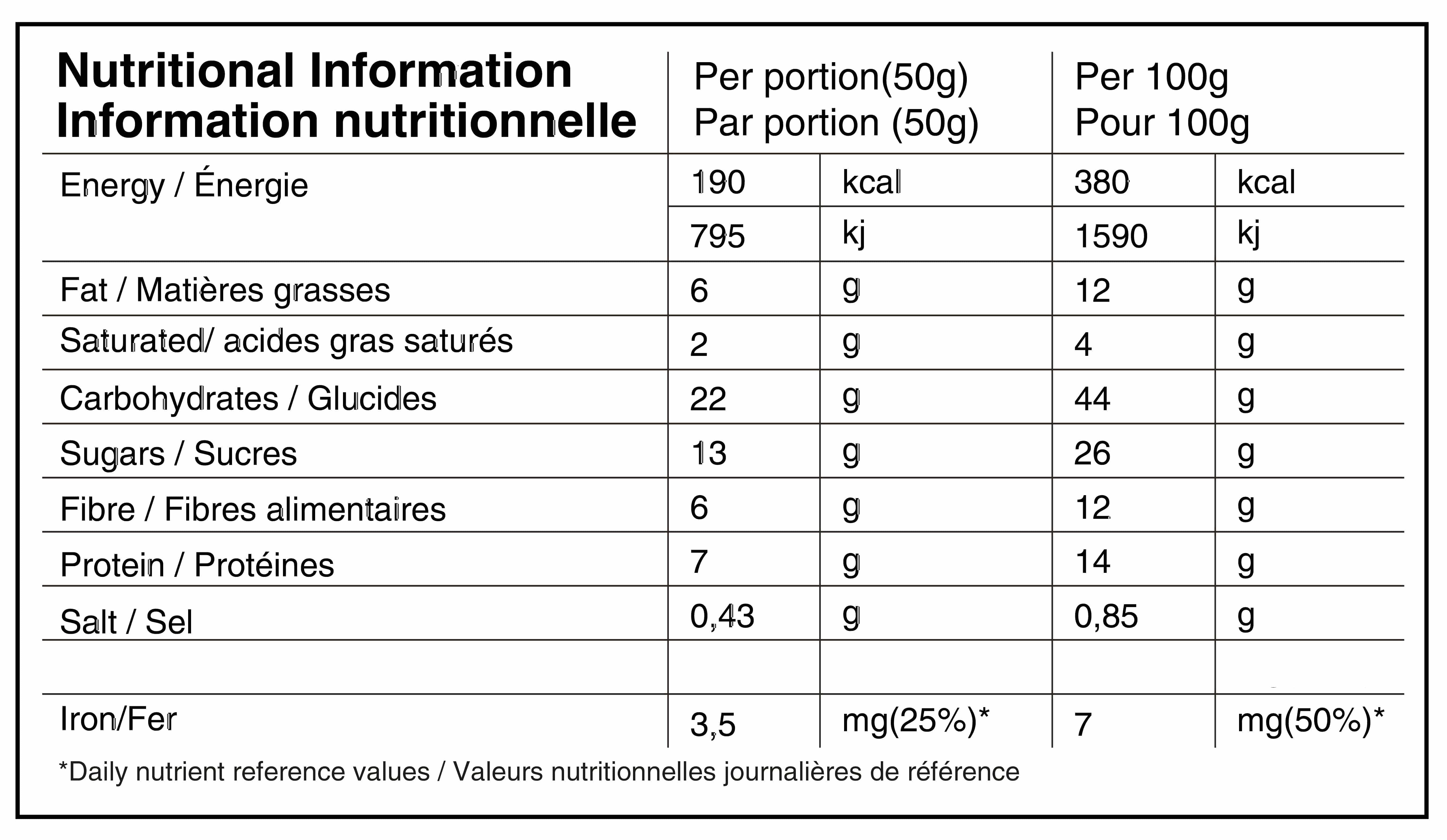 Ingrédients : Pâte de dattes, Sirop de riz brun, Beurre de graines de tournesol (graines de tournesol, huile de tournesol), Isolat de protéines de soja, Fibres de racines de chicorée, Flocons d'avoine (gluten), Pépites de riz (farine de riz, sucre de canne évaporé, sel), Café instantané séché par pulvérisation, Isolat de protéines de pois, Beurre de cacao, Arômes naturels, Gomme arabique (stabilisant), Brisures de fèves de cacao, Sel de mer, Mélange de tocophérols (anti-oxydant).